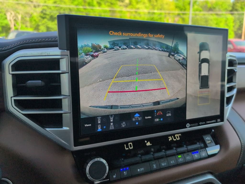 This Tundra 1794 is nicely equipped with 1794 Grade Package, Advanced Package (Color Head Up Display), 4WD, Tan Leather, 10-Way Pwr Adj Heated and Ventilated Front Seats, 12 Speakers, 3.31 Axle Ratio, 4-Wheel Disc Brakes, ABS brakes, Air Conditioning, Alloy wheels, AM/FM radio: SiriusXM, Apple CarPlay/Android Auto, Auto High-beam Headlights, Auto-dimming door mirrors, Auto-dimming Rear-View mirror, Automatic temperature control, Blind Spot Monitor, Brake assist, Bumpers: body-color, Chrome Plated Power Folding Outside Mirrors, Delay-off headlights, Driver door bin, Driver vanity mirror, Dual front impact airbags, Dual front side impact airbags, Electronic Stability Control, Emergency communication system: Safety Connect with 1-year trial, Front anti-roll bar, Front Bucket Seats, Front Center Armrest, Front dual zone A/C, Front fog lights, Front reading lights, Front wheel independent suspension, Fully automatic headlights, Garage door transmitter: HomeLink, Heated door mirrors, Heated front seats, Heated rear seats, Heated steering wheel, Illuminated entry, Knee airbag, Leather Seat Trim, Leather Shift Knob, Low tire pressure warning, Memory seat, Multi-Terrain Back Monitor, Navigation System, Occupant sensing airbag, Outside temperature display, Overhead airbag, Overhead console, Owner's Portfolio (TMS), Panic alarm, Panoramic View Back Monitor, Passenger door bin, Passenger vanity mirror, Power door mirrors, Power driver seat, Power moonroof, Power passenger seat, Power Running Boards, Power steering, Power windows, Radio data system, Radio: Audio Multimedia System, Rain sensing wipers, Rear reading lights, Rear seat center armrest, Rear step bumper, Rear window defroster, Remote keyless entry, Safety Connect, Security system, Speed control, Speed-sensing steering, Split folding rear seat, Steering wheel memory, Steering wheel mounted audio controls, Tachometer, Telescoping steering wheel, Tilt steering wheel, Traction control, Trip computer, Turn signal indicator mirrors, Variably intermittent wipers, Ventilated front seats, Ventilated rear seats, Voltmeter, and Wheels: 20 Machined Finish Alloy. Price does not include licensing costs, registration fees, taxes and dealer doc fee of $899.50 which are to be paid by the consumer.