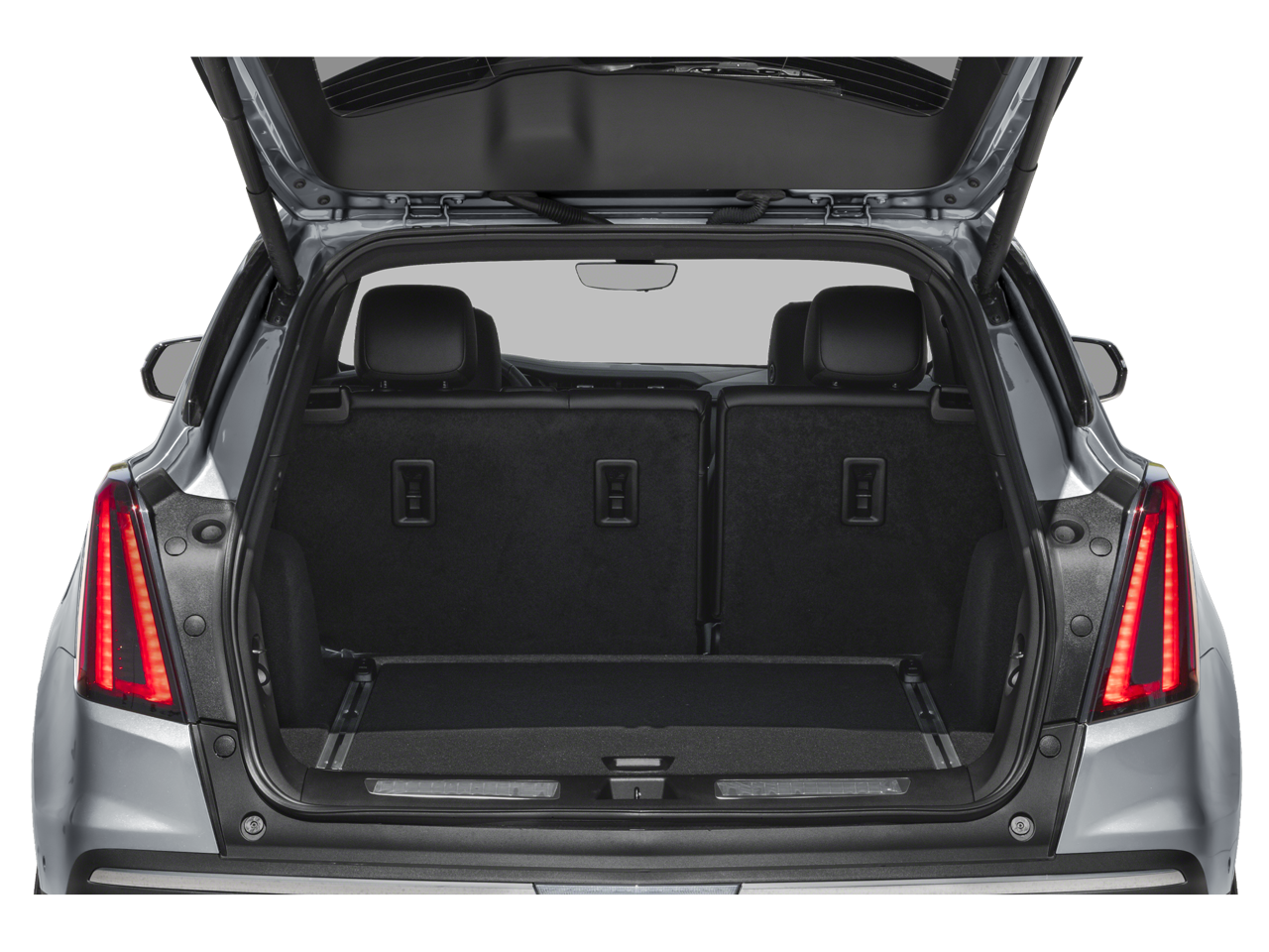 - Opens or closes when the system senses the key fob and the driver extends their foot under the left-hand side of the rear bumper over an image of the Cadillac Crest projected under the vehicle
